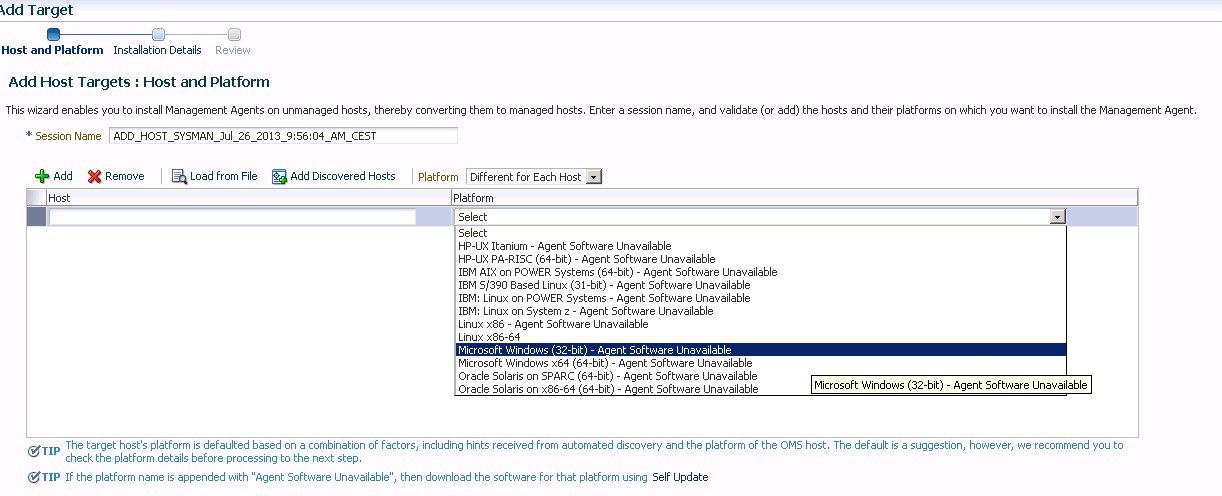 El primer paso que tenemos que dar, es el de añadir nuestros hosts, bien sea por autodescubrimiento o bien de manera manual. El problema con el que nos encontramos es que, el OEM12c no tiene instalados los agentes para los distintos hosts de las arquitecturas, por lo que tenemos que hacerlo nosotros manualmente