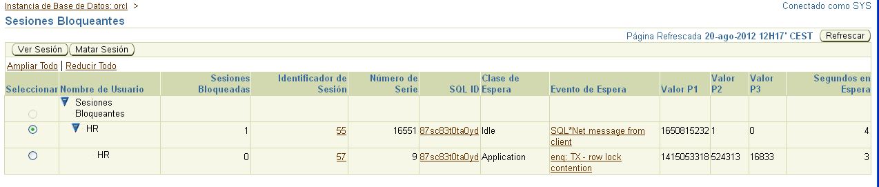 Si tras esos 5 segundos volvemos a recargar la ventana del EM veremos que no hay bloqueos, y si nos vamos a la ventana donde hemos ejecutado nuestra consulta bloquante nos encontraremos con el error: